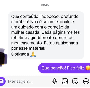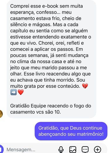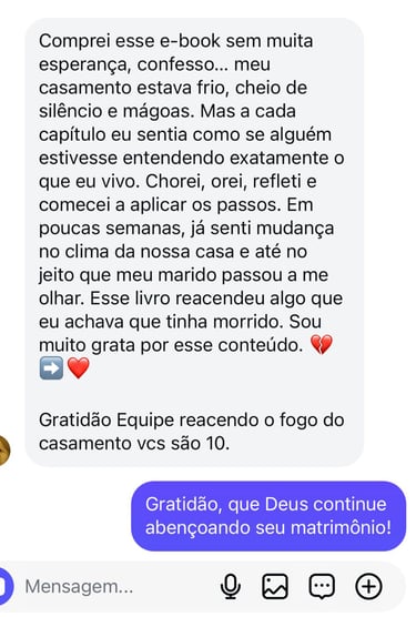 Hoje, há alguns anos, posso dizer que vivo um casamento restaurado, consciente e fortalecido — não perfeito, mas real, maduro e intencional. Criei este e-book com o propósito de ajudar mulheres que se encontram onde um dia eu estive, mostrando que existe caminho, cura e recomeço.